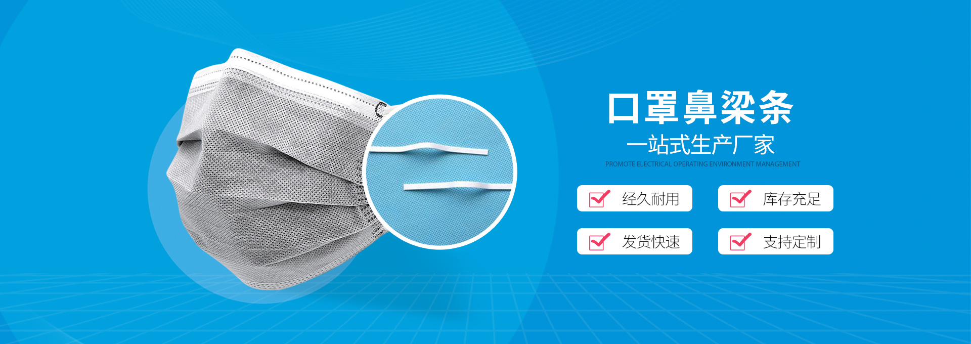 無錫辰安新材料是一家集研發(fā)、生產(chǎn)和銷售—體的現(xiàn)代化口罩物料鼻梁條、耳帶的企業(yè);公司地址位于全國創(chuàng)新型城市——江蘇省無錫市。產(chǎn)品多樣:有單芯鼻梁條、雙芯鼻梁條、全塑鼻梁條、鋁條鼻梁條、KN95、KN94口罩用鼻梁條可定制;口罩耳繩材質(zhì):氨綸、···